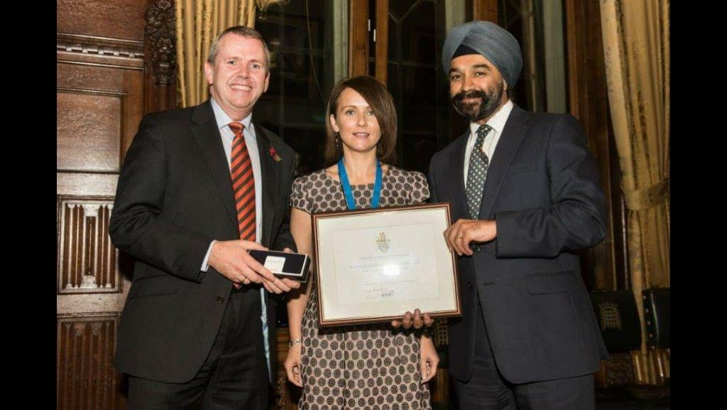 FIG 2. Angela receiving the Society of Radiographers NI Radiographer of the Year Award at the House of Commons from Harpal Kumar CEO of Cancer Research UK in November 2014.