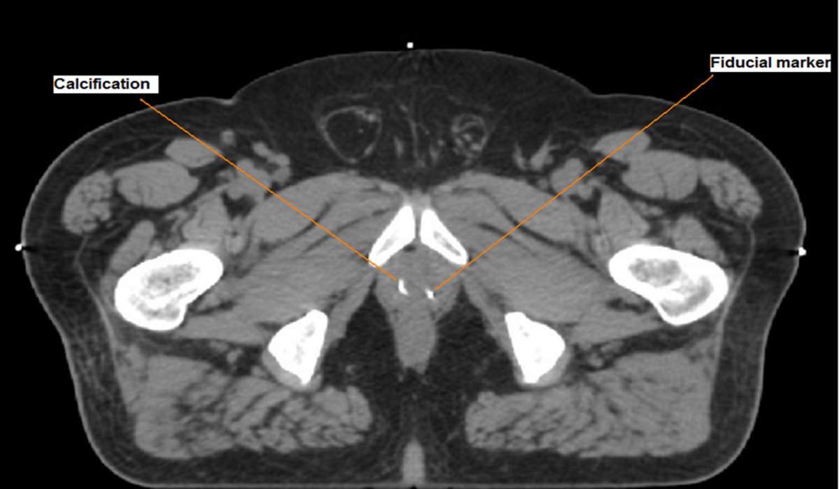 FIG 1. Image of the prostate showing surgically implanted marker and naturally occurring calcifications. The research aims to use a clinical trial to determine if the naturally occurring calcifications in the prostate can be used to effectively guide radiotherapy treatment and if this could be introduced into clinical practice.