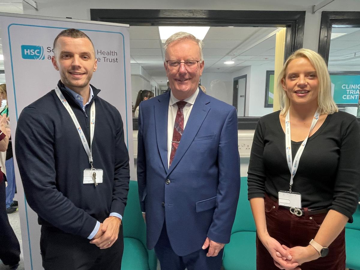 Aaron McGibbon (Research & Development Governance Co-Ordinator, South Eastern Trust) and Stephanie Kelly (Research Manager, South Eastern Trust) with Health Minister, Mike Nesbitt MLA